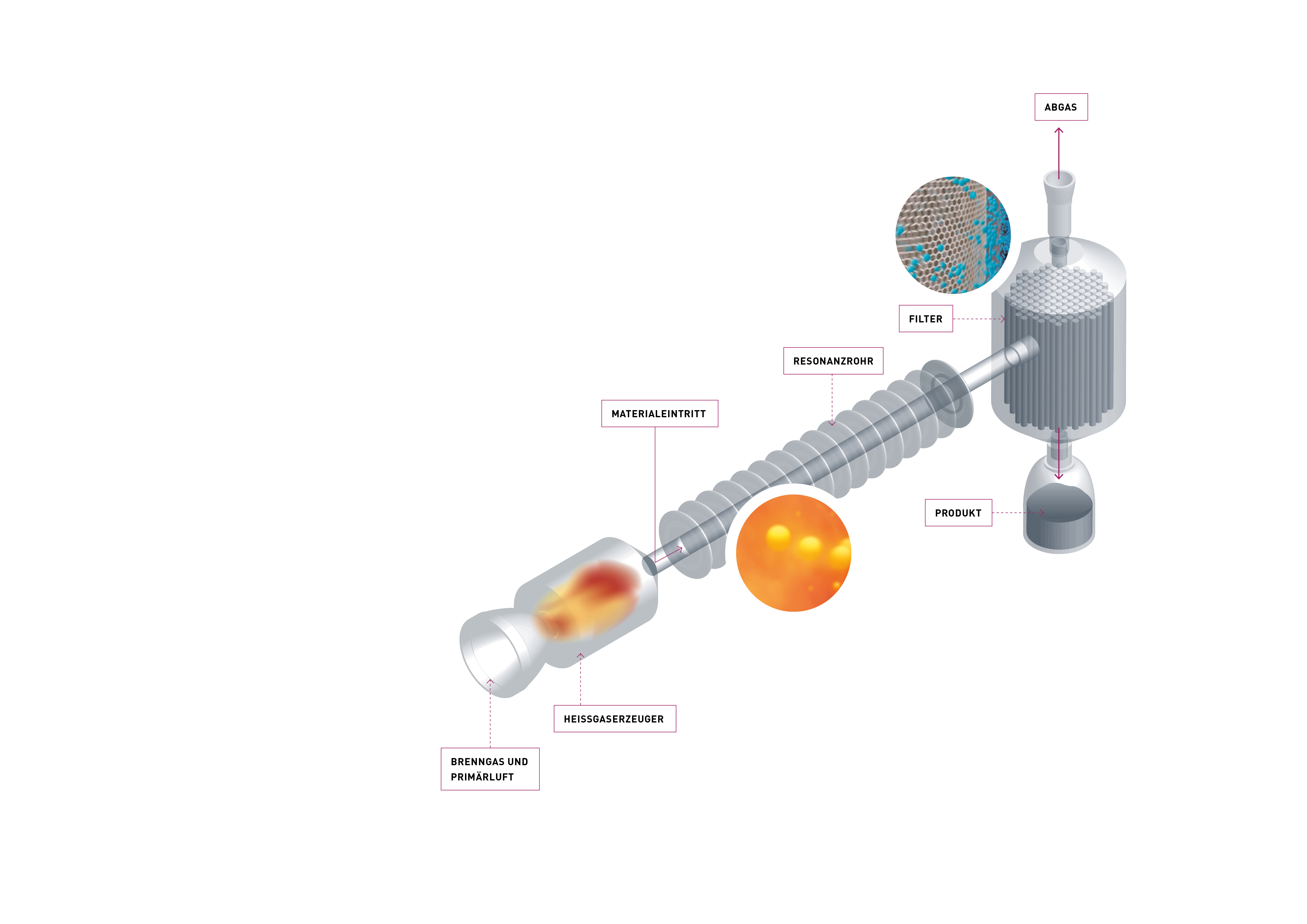 Die Materialbehandlung erfolgt durch die Heißgasströmung innerhalb des Reaktors, wo die gewünschte Reaktion in 0,05 bis 2,0 s stattfindet. Durch eine Schock-Abkühlung (mit kaltem Gas) wird die Reaktion gezielt beendet. Am Ende des Rohres befindet sich der Filter, in dem das erzeugte Material abgeschieden und anschließend abgefüllt wird. Da im gesamten Reaktor ein leichter Unterdruck herrscht, ist ein Austreten des Produktes ausgeschlossen. So erreichen wir einen hohen Umsatzgrad während des Prozesses.