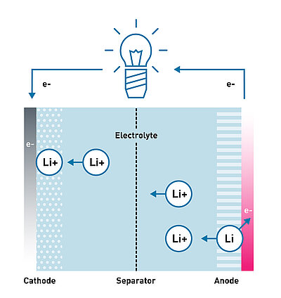 Beim Laden einer Lithium-Ionen-Batterie beziehungsweise von Lithium-Ionen-Akkus werden Lithium-Ionen durch die Elektrolytschicht von der Kathode zur Anode transportiert. In der Anode, die häufig aus Graphit oder anderen kohlenstoffreichen Materialien besteht, erfolgt die reversible Einlagerung des Lithiums unter Aufnahme von Elektronen. Beim Entladen der Batterie kehrt sich dieser Prozess um. Die Lithium-reiche Anodenschicht gibt Elektronen ab und die entstehenden Lithium-Ionen werden zur Kathode transportiert. Der dabei entstehende Stromfluss kann von elektrischen Verbrauchern genutzt werden. Dieser Zyklus kann bei Akkus mehrfach durchlaufen werden, wobei jedoch gewisse Memory-Effekte unausweichlich sind. Je hochqualitativer die Batterie und die in ihr verwendeten Materialien wie das Lithium-Eisen-Phosphat, desto höher kann die Lebensdauer sein.